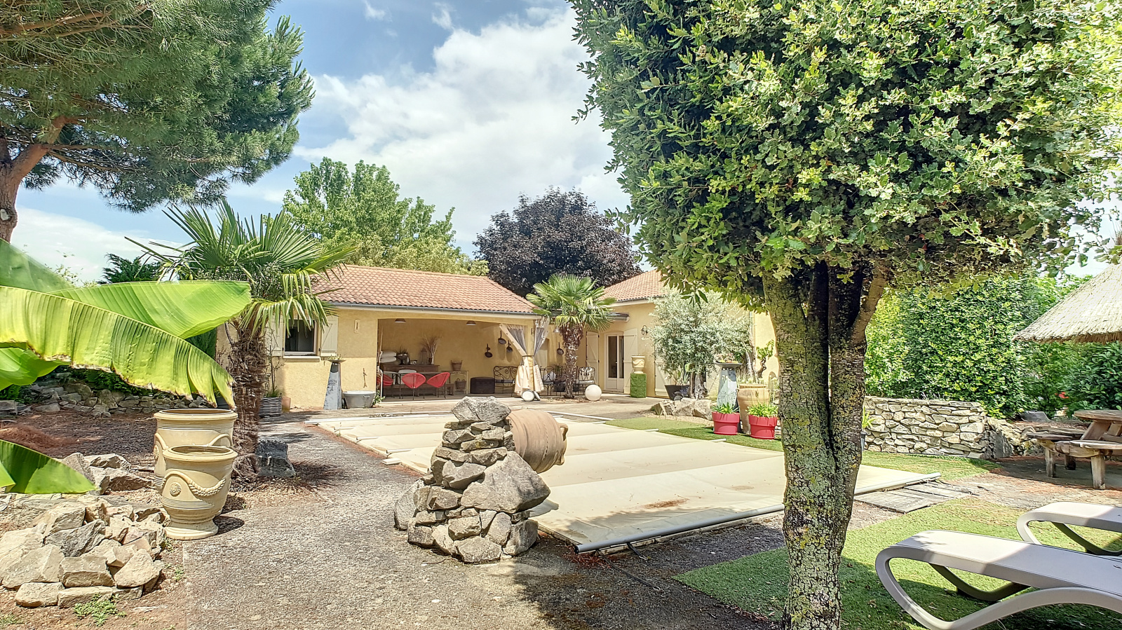 Exclusivité, Villeneuve l'Abbé sur la commune de Saint-Ignat, Maison plain-pied sur une terrain plat de 2000 m² arboré et fleuri, avec belle pièce de vie, cuisine équipée indépendante, 3 chambres, bureau en mezzanine, grande salle de bains avec douche et baignoire. Terrasse couverte sur piscine, pool-house, grand garage, dépendances.
